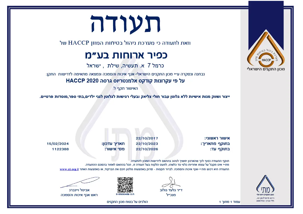 כל מנה מיוצרת תחת פיקוח קפדני, בעמידה בתקנים בינלאומיים מחמירים (ISO, HACCP, GMP), ותחת השגחה של משרד הבריאות.